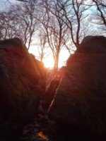 Ich bin ja nicht alleine auf der Welt und so zieht es nicht nur mich dort hin. Und so begegnen sich Menschen der seltsamsten Art hier und ich zähle mich dazu. Überraschend, wenn du auf einmal deiner Cousine gegenüber stehst, die zusammen mit anderen zu dem Ort kamen um ihren alten Weg zu gehen. Oder du einem Nachbarn dort triffst der deinen Stab mit den Runen darauf bewundert und du dich fragst woher er wohl die Runen kennt, bis du erfährst dass er sich auch dafür interessiert. Oder dem Typ der plötzlich mit einer Zigarette in der dunklen Nacht vor mir stand und der sich einfach alleine nicht mehr runter traute. Aber auch die vielen flüchtigen oder manchmal auch nur zu erahnenden „Begegnungen“ Ritzungen in Bäumen. Die tatsächlich nicht von mir stammen obwohl das einige dachten. Oder auch Zeichnungen an Felsen zeugten und zeugen davon wie wichtig der Ort auch für andere ist.